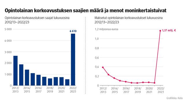Opintolainan korkoavustuksen saajien määrä ja menot moninkertaistuivat