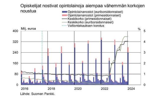 Opiskelijat nostivat opintolainoja aiempaa vähemmän korkojen noustua