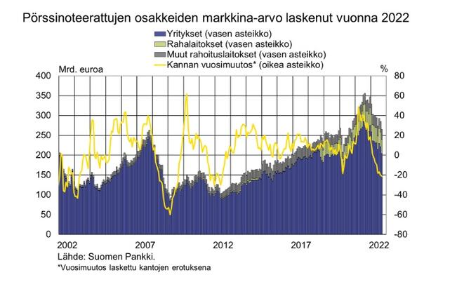 Suomalaisten osakkeiden ja velkapapereiden markkina-arvot laskeneet kuluvana vuonna
