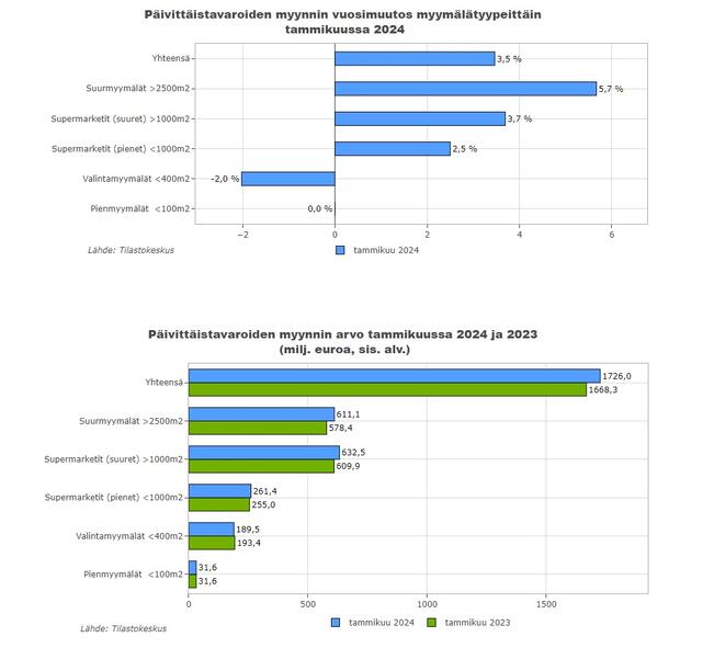 Päivittäistavaroiden vähittäismyynti kasvoi tammikuussa 3,5 prosenttia