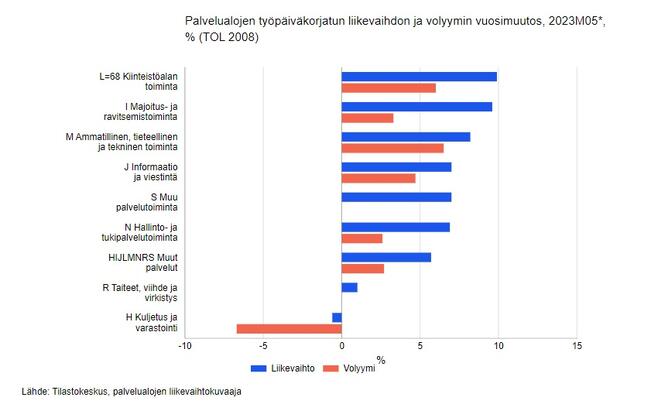 Palveluiden liikevaihto kasvoi 5,7 prosenttia ja volyymi 2,7 prosenttia toukokuussa