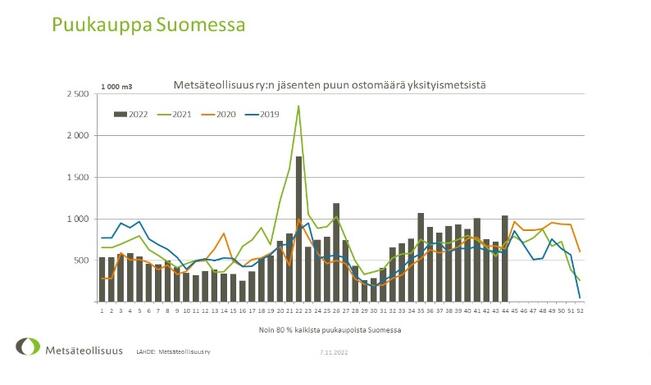 Metsäteollisuus ry:n jäsenet ostivat tammi–lokakuussa puuta yksityismetsistä 32,3 miljoonaa kuutiota. Määrä on 16 prosenttia enemmän kuin edellisen vuoden vastaavana aikana. Viiden vuoden vastaavan ajan keskiarvoon verrattuna määrä on 20 prosenttia suurempi.
