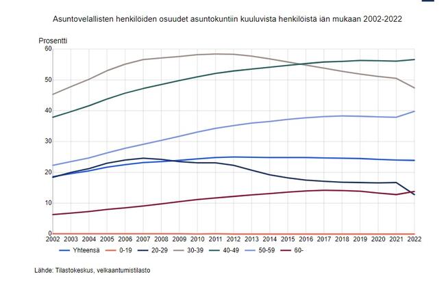 Alle 40-vuotiaiden henkilöiden asuntovelallisuus pieneni yhä viime vuonna