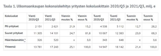 Pk-yritysten vienti kasvoi 21,9 prosenttia vuoden kolmannella neljänneksellä