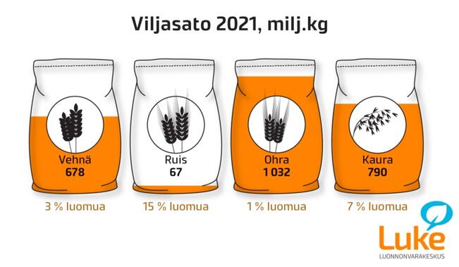 Vuoden 2020 viljasadon pääviljan, ohran, sato jäi viidenneksen keskimääräisestä. Samoin kävi vehnä- ja ruissadoille. Sen sijaan kaurasato ylittää kymmenen vuoden keskisadon kymmenyksellä.
