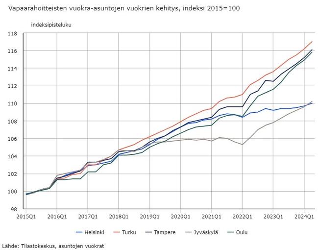 Vapaarahoitteisten asuntojen vuokrat nousivat koko maassa 0,5 prosenttia huhti–kesäkuussa vuodentakaisesta. Pääkaupunkiseudulla vapaarahoitteiset vuokrat kuitenkin laskivat 0,3 prosenttia, kun muualla maassa nousua nähtiin 0,9 prosenttia. Vuokrat nousivat suurista kaupungeista eniten Rovaniemellä (2,0 %) ja laskivat eniten Vantaalla (-0,8 %).