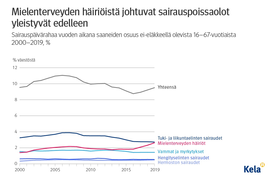 Viime vuonna noin 84 000 henkilöä sai sairauspäivärahaa mielenterveyden häiriöiden perusteella. Määrä kasvoi vuodesta 2018 lähes 10 000 henkilöllä. Mielenterveyden häiriöiden perusteella sairauspäivärahaa saaneiden lukumäärä on kasvanut vuosien 2016 ja 2019 välillä peräti 43 prosenttia.
