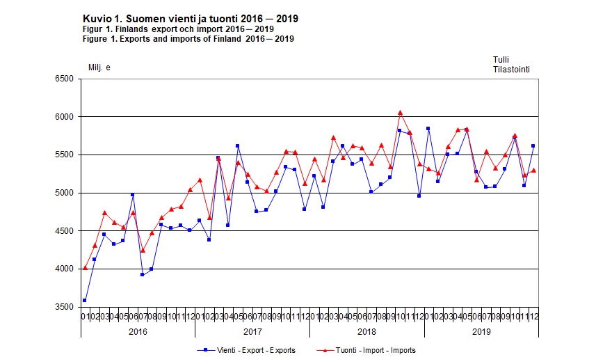Tuonnin arvo laski joulukuussa 1,5 prosenttia ja oli noin 5,3 miljardia euroa. Tuontihinnat nousivat 1,9 prosenttia, mutta tuontimäärät laskivat 2,7 prosenttia vuoden 2018 joulukuuhun verrattuna. Tammi–joulukuussa viennin arvo kasvoi 2,0 prosenttia, mutta tuonnin arvo laski 1,4 prosenttia vuoteen 2018 verrattuna.