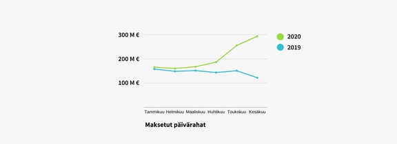 Päivärahaa maksettiin kesäkuussa 209 000 henkilölle. Saajien määrä kasvoi kesäkuussa 118 prosenttia viime vuoden kesäkuuhun nähden. Saajista 109 000 sai ansiopäivärahaa lomautuksen ajalta. Lomautettuja oli kesäkuussa 14-kertainen määrä vuoden takaiseen tilanteeseen nähden. 90 prosenttia saajien määrän kasvusta selittyykin lomautusten lisääntymisellä.