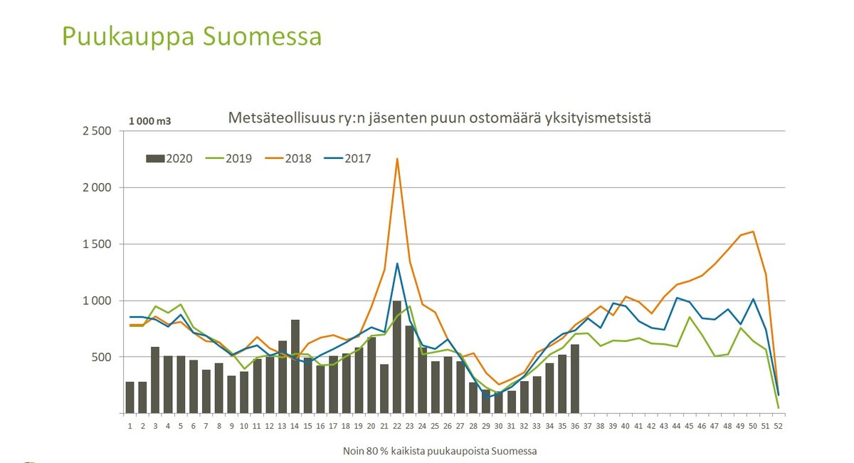 Metsäteollisuus ry:n jäsenyritykset ostivat tammi–elokuussa puuta yksityismetsistä 16,6 miljoonaa kuutiota, mikä on 21 prosenttia vähemmän kuin viiden edellisen vuoden keskiarvo vastaavana aikana. Kuitupuun ostomäärä oli 8,9 miljoonaa kuutiota, eli 20 prosenttia vähemmän ja tukkien ostomäärä 6,9 miljoonaa kuutiota, eli 23 prosenttia vähemmän kuin viitenä edellisenä vuonna keskimäärin.