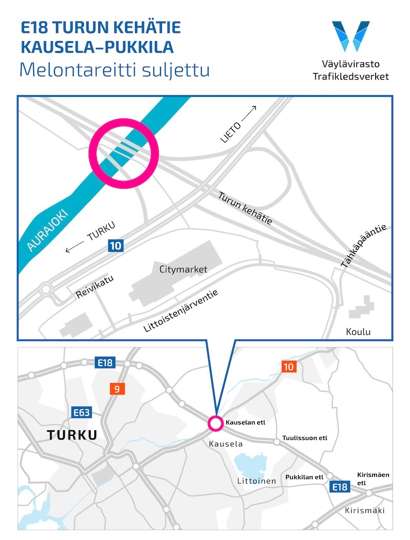 Turun kehätie -hankkeen toinen rakennusvaihe on käynnistynyt suunnitelmien mukaan. Aurajoen ylittävien kehätien siltojen parannus- ja rakennustyöt vaativat Aurajoen melontareitin sulkemista. Melontareitti kehätien siltojen kohdalta suljetaan keskiviikkona 23. syyskuuta. Reitti pysyy suljettuna ensi vuoden maaliskuun loppuun asti.