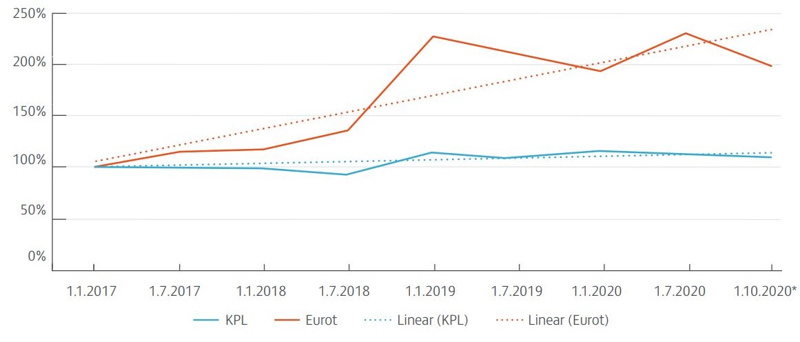 Yritysten velkamäärä on kääntynyt kasvuun sekä euroissa että kappalemäärissä. Huomioitavaa on, että yritysten yksittäisten velkojen euromääräinen kasvu on selkeästi voimakkaampaa kuin velkojen kappalemäärien kasvu.