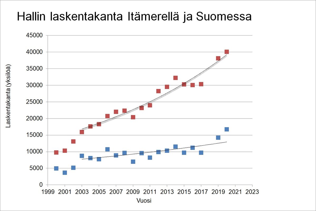 Laskennoissa nähtyjen hallien määrä on pysynyt vuosia noin 30 000 yksilössä, mutta nyt tulos on jo toisena vuonna peräkkäin kasvanut noin 40 000 yksilöön. Vuodesta 2003 lähtien Itämeren hallikanta on kasvanut keskimäärin noin viisi prosenttia vuodessa. Kasvu on viime vuosina ollut voimakkainta eteläisellä Itämerellä, mikä johtuu pääosin muilta alueilta siirtyvistä halleista.