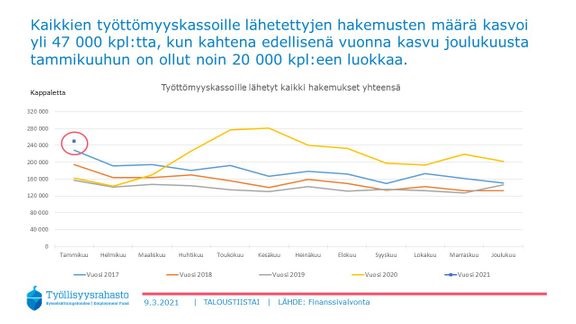 – Kolmena edellisenä vuonna ensihakemusten määrä on myös noussut tammikuussa joulukuun luvuista, mutta tänä vuonna nousu vaikuttaisi olleen poikkeuksellisen suurta, kertoo Työllisyysrahaston rahoitusanalyytikko Antti Klemola.