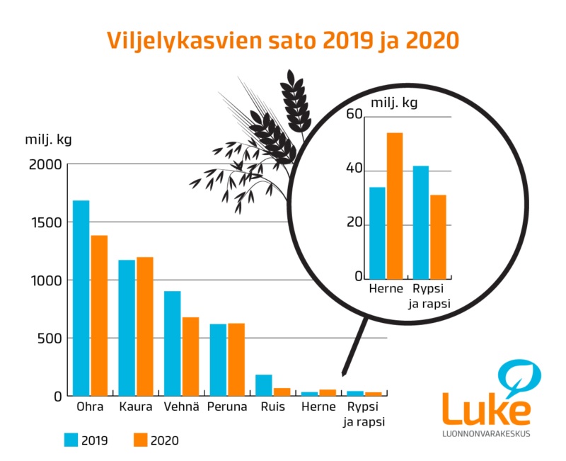 Kaurasato kasvoi edellisvuodesta muutaman prosentin ja oli yli kymmenyksen suurempi kuin keskimäärin viimeisen kymmenen vuoden aikana. Kaurasadon määrä (1,2 miljardia kiloa) on jo melko lähellä eniten viljellyn viljamme ohran satoa (1,4 miljardia kiloa). Viimeksi kaurasadon määrä oli näin lähellä ohrasatoa 30 vuotta sitten vuonna 1990, jolloin molemmista korjattiin huippusadot.
