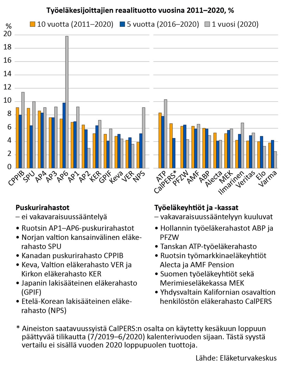 Suurimmat tuotot vuosina 2011–20 keräsivät Kanadan työeläkerahasto CPPIB (9,1 %), Norjan kansainvälinen eläkerahasto SPU (9,0 %) ja ruotsalainen puskurirahasto AP4 (8,6 %). Kaikki kolme ovat tehneet tasaisen vakuuttavaa jälkeä ja hyötyneet vuosikymmenen kestäneestä osakkeiden arvon noususta.
