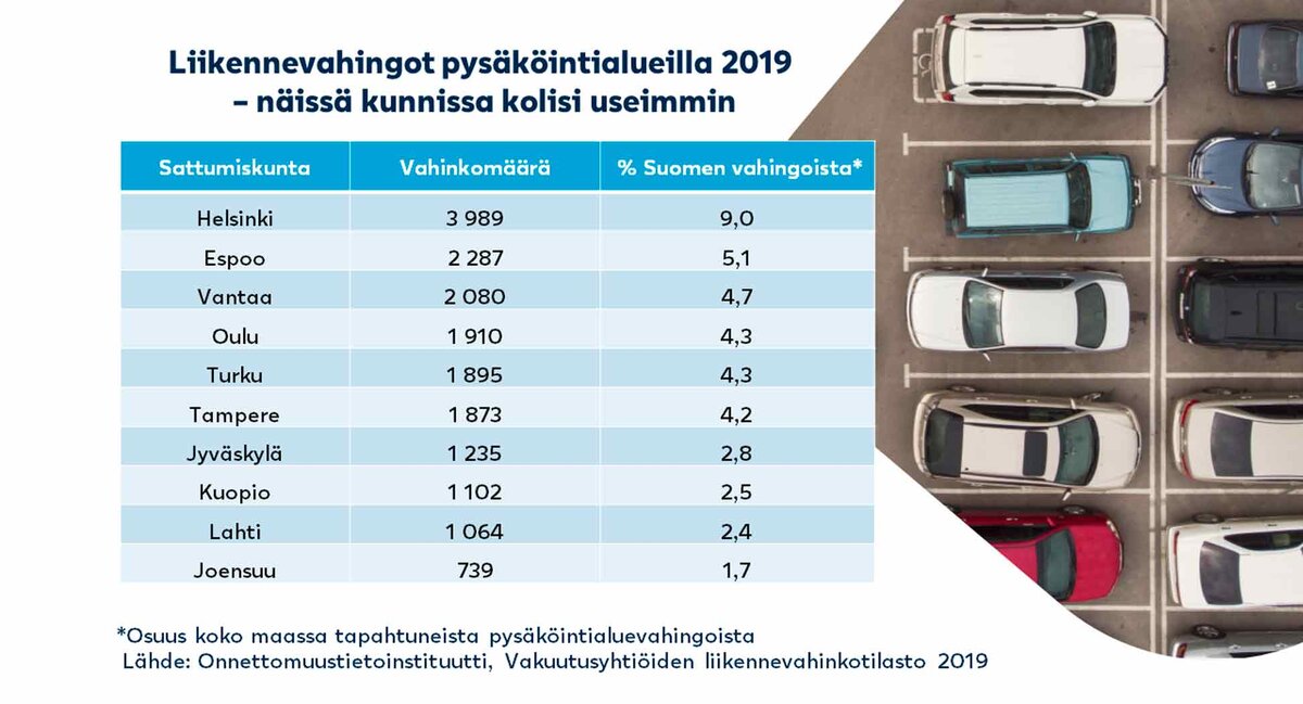 Pysäköintialueilla sattuu Suomessa kymmeniätuhansia liikennevahinkoja joka vuosi. Useimmin pysäköintialueilla kolisee Uudenmaan suurissa kaupungeissa mutta tuhansia vahinkoja sattuu vuosittain myös muiden maakuntien keskuksissa, selviää Onnettomuustietoinstituutin tilastosta. Matalalla vauhdilla sattuvista törmäyksistä selvitään onneksi usein ilman loukkaantumisia, mutta peltikolari voi ikävästi keskeyttää matkanteon tai aiheuttaa yllättävän suuret korjauskulut.
