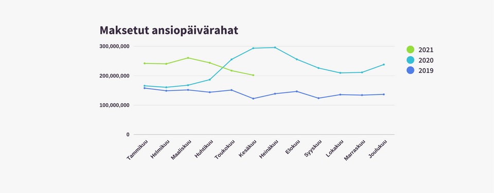 Ansiopäivärahaa on maksettu tänä vuonna kesäkuuhun mennessä 1,4 miljardia euroa. Tämä on 14 prosenttia enemmän kuin alkuvuoden 2020 aikana ja 61 prosenttia enemmän kuin vuoden 2019 alkupuoliskolla. Maksettujen ansiopäivärahojen määrä on kuitenkin laskenut viime kuukausina. Kesäkuun ansiopäivärahakulut olivat lähes neljänneksen maaliskuun kuluja pienemmät.