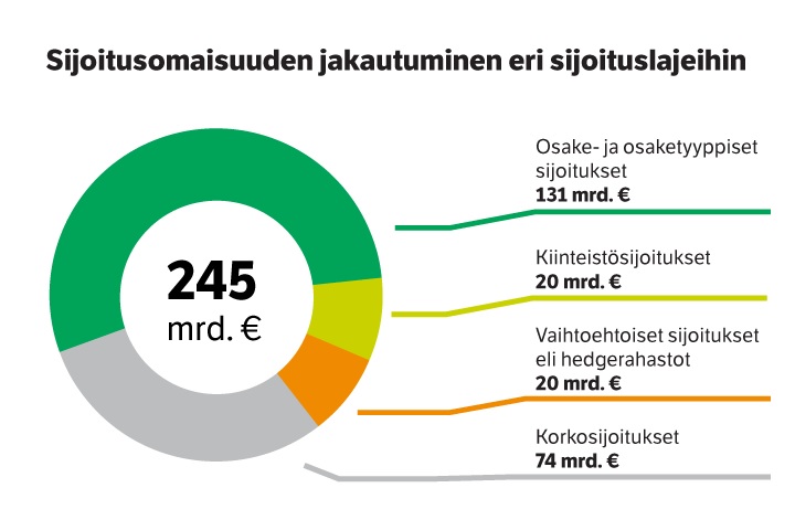 Työeläkesijoitusten omaisuuslajikohtainen jakautuminen pysyi käytännössä ennallaan. Osake- ja osaketyyppisten sijoituksien osuus oli syyskuun lopussa noin 53 prosenttia, korkosijoituksien osuus 30 prosenttia, kiinteistösijoituksien kahdeksan prosenttia ja vaihtoehtoisten sijoituksien kahdeksan prosenttia.