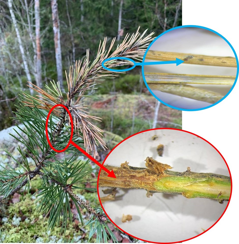 – Elokuussa 2021 männyntaimien vuosikasvaimissa havaittiin huomattavaa tuhoa useassa Etelä-Suomen kohteessa. Tuho on varmistunut etelänversosurmaksi, jonka aiheuttaa havuparikas-sieni. Sienen alkuperä on tuntematon, sanoo Luonnonvarakeskuksen tutkija Eeva Terhonen.
