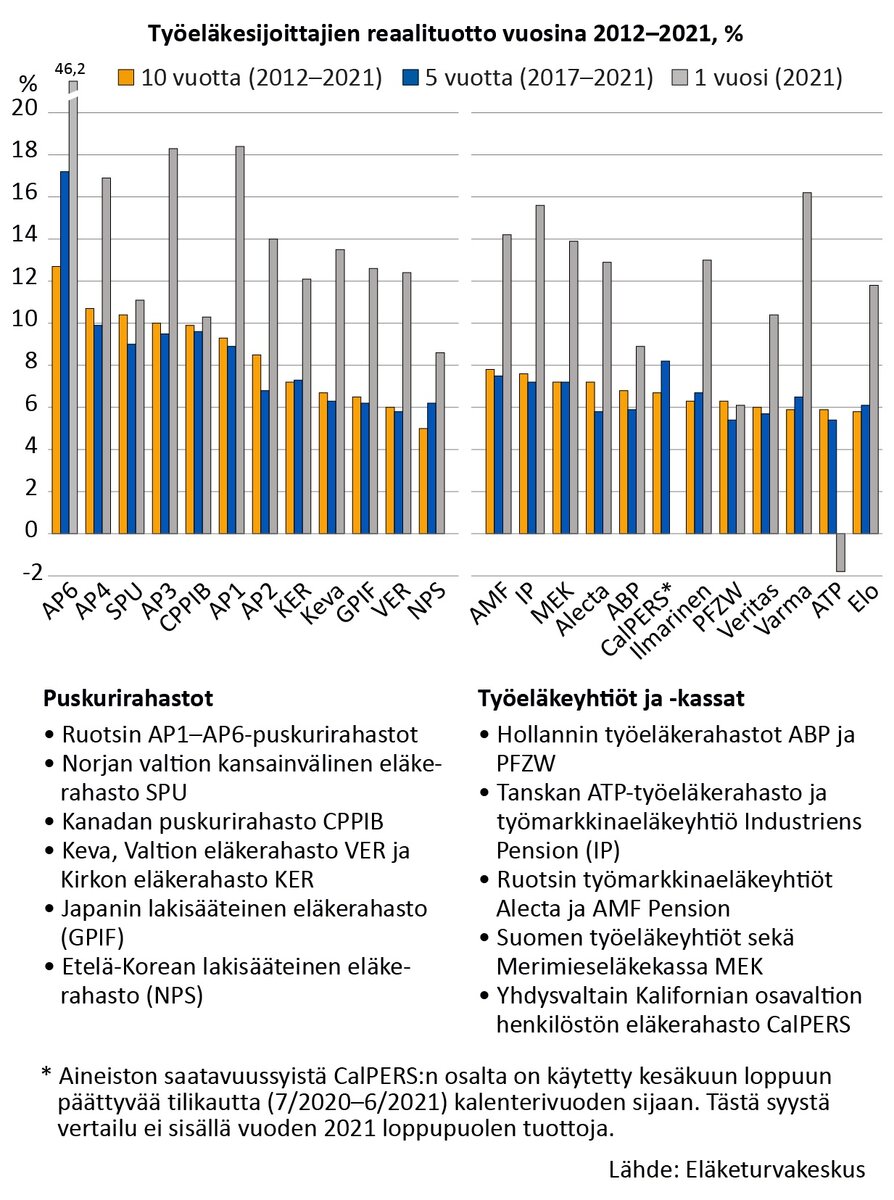 Suurin osa vertailun eläkerahastoista ylsi 10–20 prosentin reaalituottoon vuonna 2021. Erityisen hyvin pärjäsivät Ruotsin työeläkejärjestelmän AP-rahastot, jotka veivät kaikki vertailun mitalisijat. Vuosi oli hyvä myös suomalaisille eläkesijoittajille, erityisesti Varma erottui edukseen.