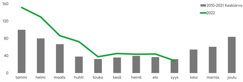 Fennian vahinkotilastojen mukaan ajoneuvojen tieltä suistumisten määrä lähtee selvään kasvuun syyskuun jälkeen. Eniten suistumisia tapahtuu tammikuussa.