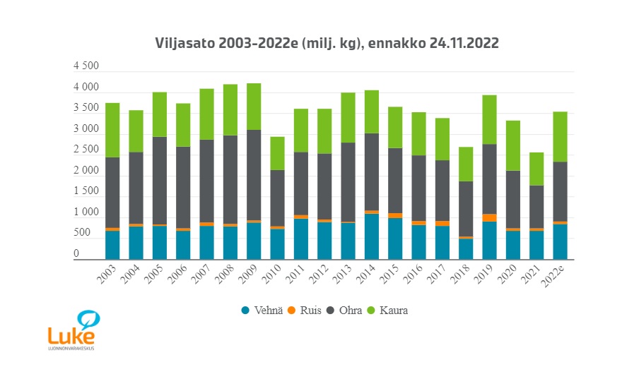 Ohran, kauran, vehnän ja rukiin yhteenlaskettu satomäärä, 3,6 miljardia kiloa, on keskimääräinen kymmenvuotisjaksolla. Määrä on 38 prosenttia suurempi kuin katovuoden 2021 viljasato. Maatiloilla ja viljateollisuudessa viljavarastot hupenivat kesällä ennen sadonkorjuuta tavanomaista pienemmiksi. Vasta korjattu viljasato taannee vuodeksi eteenpäin lähes normaalin kotimaisen viljankäytön.