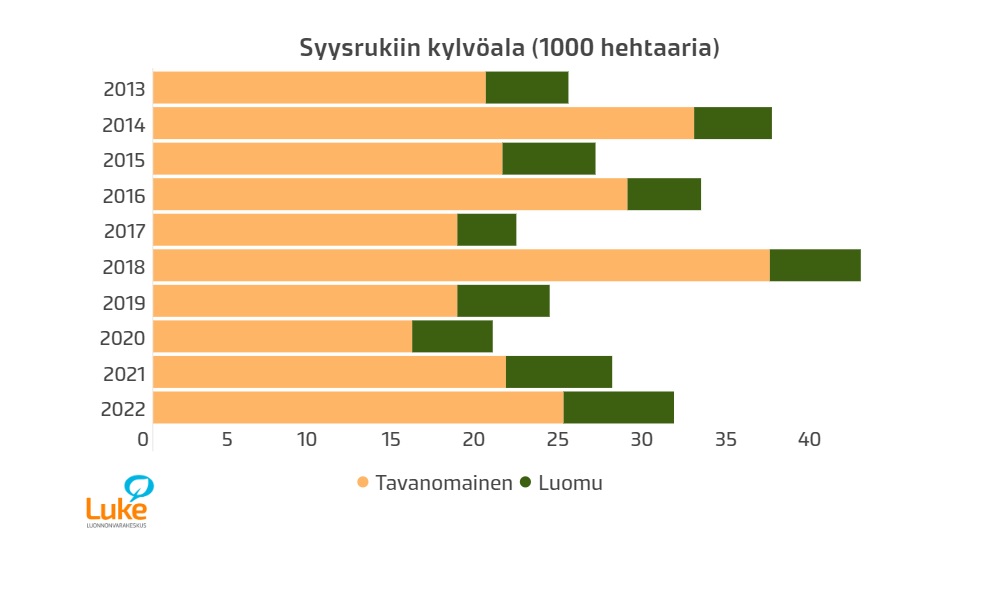 – Kaikkia kolmea tärkeintä syyskylvökasviamme kylvettiin luomupelloille hieman enemmän kuin viime vuonna. Syysruis on eniten luomuna viljelty syysvilja. Sen kylvöala oli noin 6 600 hehtaaria eli noin viidennes Suomen syysrukiin kylvöalasta. Syysvehnän ala lähenee jo syysrukiin kylvöalaa luomussa, se on noin 4 600 hehtaaria. Luomuna kylvetty syysrypsi- ja -rapsiala oli jo 3 700 hehtaaria eli kokonaiskylvöalasta yli puolet oli luomukylvöksiä, toteaa yliaktuaari Anneli Partala Luonnonvarakeskuksesta (Luke).