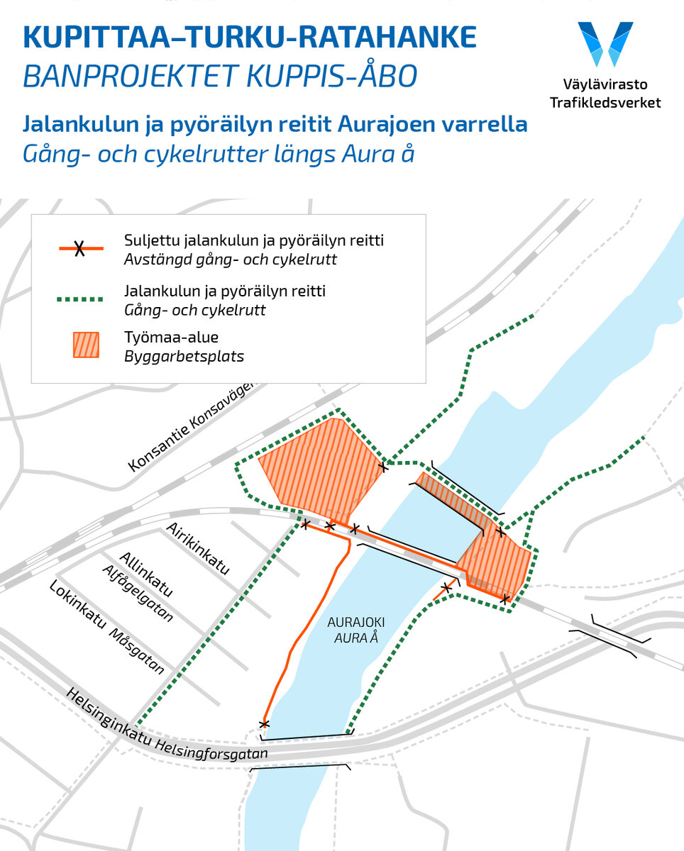 Jalankulun ja pyöräilyn reitti siirtyy Aurajoen ratasillalta Raunistulan työsillalle