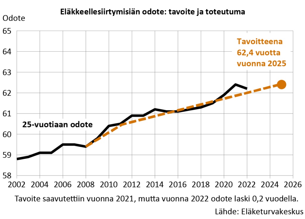 Eläketurvakeskuksen (ETK) tilastojen mukaan suomalaisten eläkkeellesiirtymisikä laski ennakoidusti edellisvuodesta. Vuonna 2022 eläkkeellesiirtymisiän odote oli 62,2 vuotta, laskua kaksi kymmenystä vuodesta 2021. Pudotus johtui erityisesti vanhuuseläkkeen aloittaneiden määrän kasvusta.