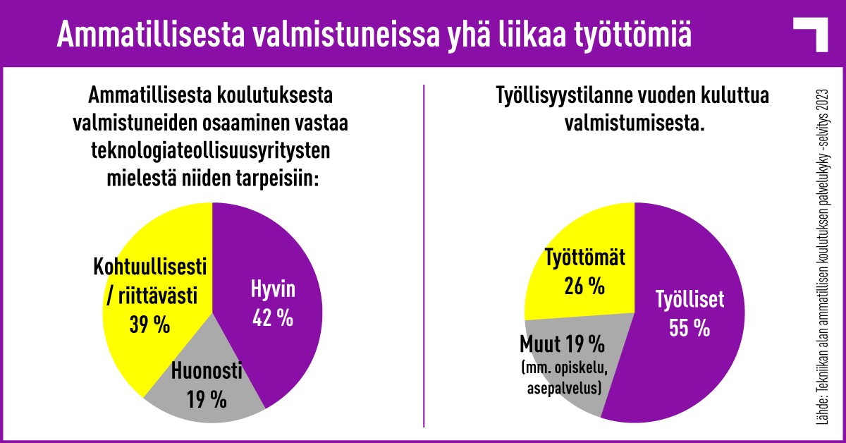 Ammatillisen koulutuksen suorittaneiden osaaminen vastaa Teknologiateollisuus ry:n jäsenyritysten mukaan melko hyvin yritysten tarpeisiin. Teknologiateollisuuden teettämässä laajassa selvityksessä tätä mieltä oli 81 prosenttia kyselyyn vastanneista yrityksistä. Koulutuksen kyvyssä vastata työelämän muuttuviin osaamistarpeisiin on kuitenkin yhä parantamisen varaa, ja liian suuri osa on työttömänä vuosi valmistumisen jälkeen.