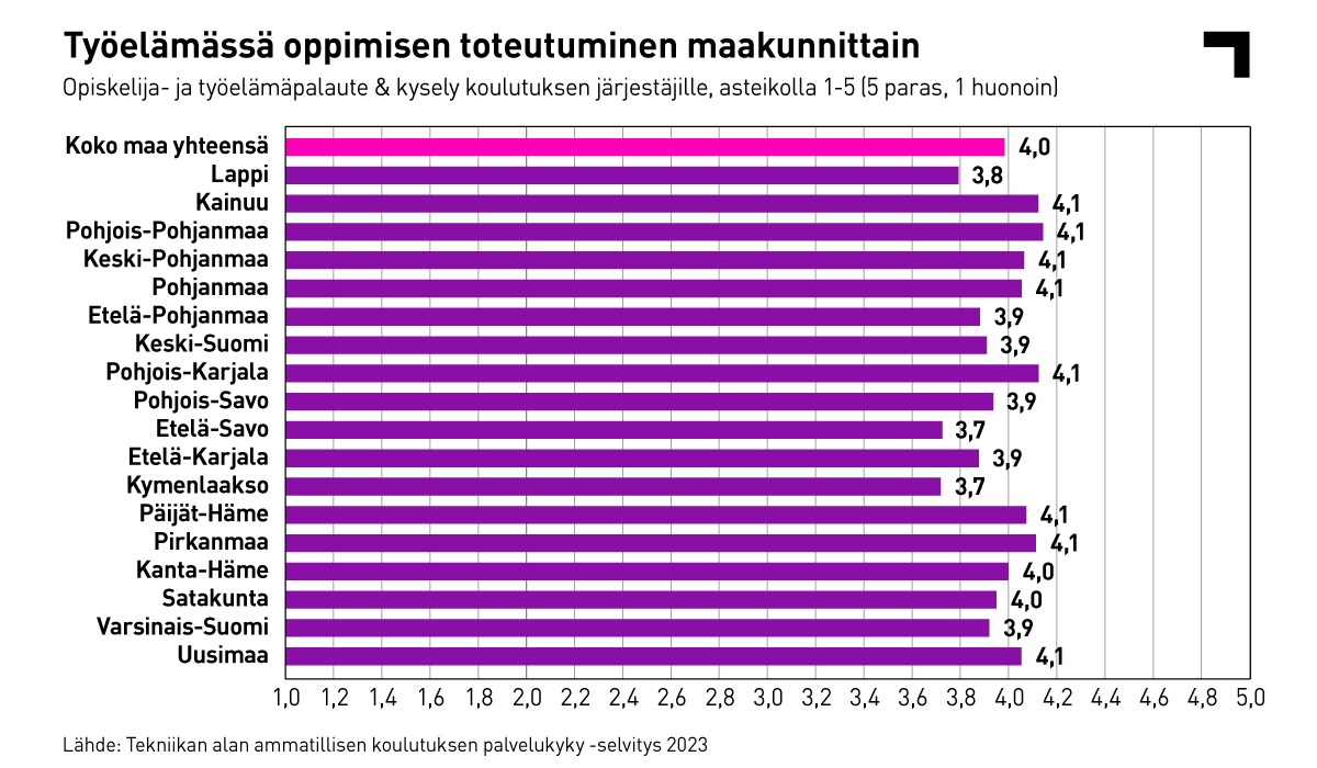 Oppilaitokset olivat laajasti tyytyväisiä työelämässä oppimisen toteutukseen. Keskimääräistä alemman arvion se sai Etelä-Savossa, Kymenlaaksossa ja Lapissa, mutta niissäkin arviot olivat kohtuullisen hyviä.