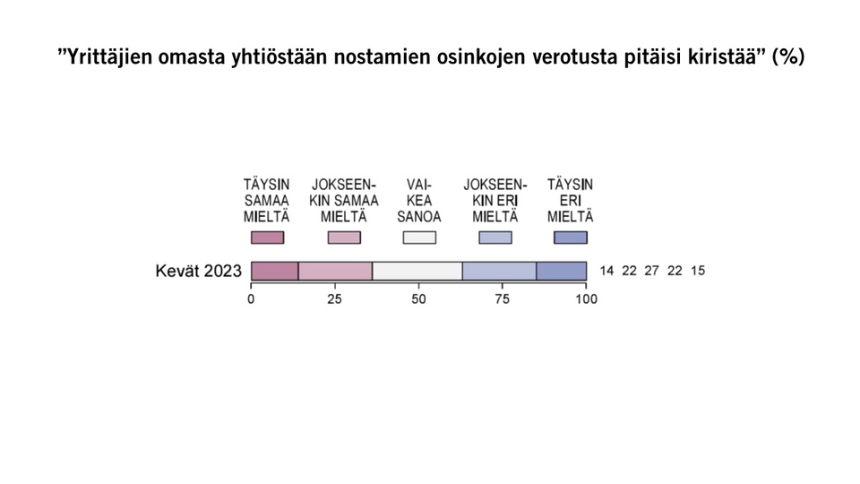 Suomalaisista 47 prosenttia katsoo, että yrittäjäriskin huomioiminen keventävänä tekijänä yrittäjän osinkoverotuksessa on jatkossakin perusteltua. 18 prosenttia katsoo, ettei yrittäjäriskin huomioiminen verotuksessa ole perusteltua.