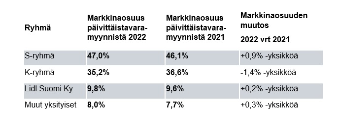 Päivittäistavaroiden verkkokauppa jatkoi edelleen kasvuaan muun muassa vuonna 2022 aloittaneen Odan ansiosta. Kahden ensimmäisen pandemiavuoden kaksi- ja kolminumeroisia kasvulukuja päivittäistavaroiden verkkokaupassa ei kuitenkaan enää nähty vuonna 2022.