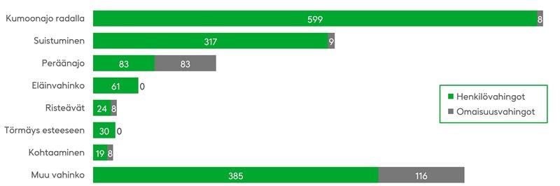 Onnettomuustietoinstituutin tilastojen mukaan suurin osa vahingoista on kumoonajoja ajoradalla. Tällöin esimerkiksi moottoripyörän tasapaino pettää esimerkiksi liikennevaloissa tai hyvin hitaasti ajettaessa, ja pyöräilijä kaatuu pyörän kanssa. Vammat eivät useinkaan ole vakavia.