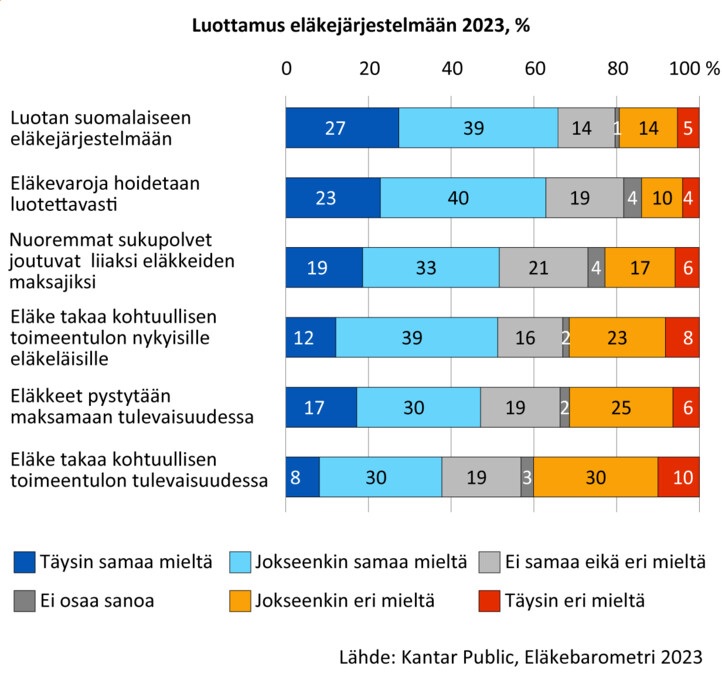 Suomalaisista 66 prosenttia luottaa eläkejärjestelmään, mikä on kuusi prosenttiyksikköä vähemmän kuin vuotta aiemmin. Lähes 50 prosenttia vastaajista arvioi, että eläkkeet pystytään maksamaan tulevaisuudessa. Edellisessä kyselyssä hieman suurempi osa, 55 prosenttia, ennakoi, että eläkkeet kyetään maksamaan tulevaisuudessakin. Lisäksi noin puolet on sitä mieltä, että nuoremmat sukupolvet joutuvat liiaksi eläkkeiden maksajiksi.