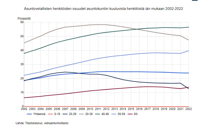 Tilastokeskuksen mukaan asuntovelallisia henkilöitä oli 20–29-vuotiaista 12,8 prosenttia ja 30–39-vuotiaista 47,4 prosenttia vuonna 2022. Vuonna 2011 asuntovelallisten henkilöiden osuudet olivat 20–29-vuotiailla 23,1 prosenttia ja 30–39-vuotiailla 58,4 prosenttia. Vanhemmissa ikäryhmissä asuntovelallisten henkilöiden osuudet kasvoivat vuodesta 2011 vuoteen 2022.
