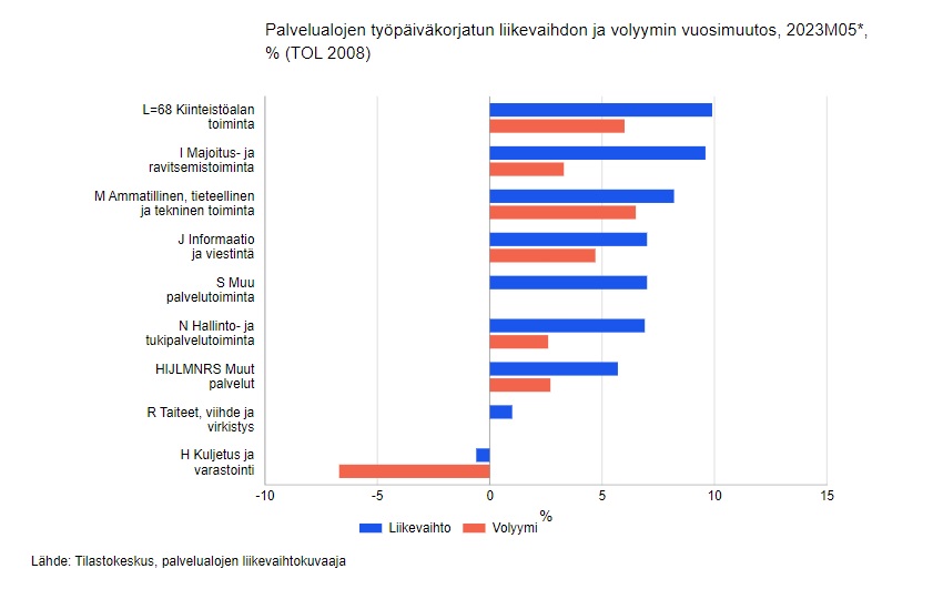 Tilastokeskuksen mukaan palvelualojen työpäiväkorjattu liikevaihto nousi toukokuussa 5,7 prosenttia vuoden 2022 toukokuusta. Palvelutuotanto eli volyymi, josta hintojen muutosten vaikutus on poistettu, kasvoi samaan aikaan 2,7 prosenttia. Huhtikuussa liikevaihto kasvoi 6,4 prosenttia ja volyymi nousi vastaavasti 2,8 prosenttia. Palvelualoissa ei ole mukana kaupan toimialoja.