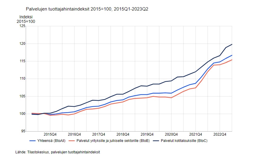 Palvelujen tuottajahintoja yhteensä (Business to All, BtoAll) nosti vuoden takaisesta erityisesti ravitsemispalvelujen, omien tai vuokrakiinteistöjen vuokraus- ja hallintapalvelujen sekä terveydenhuoltopalvelujen kallistuminen. BtoAll-indeksin nousua puolestaan hillitsi muun muassa liikkeenjohdon konsultointipalvelujen, televiestintäpalvelujen sekä meri- ja rannikkovesiliikenteen tavaraliikennepalvelujen halpeneminen vuoden 2022 toisesta vuosineljännestä.