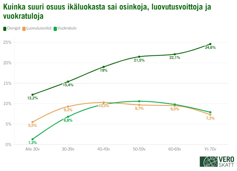 Osinkotuloja saavat tyypillisesti vanhemmat ikäluokat: yli 70-vuotiaista joka neljäs sai osinkotuloa ja vastaavasti 40–69-vuotiaissa noin viidesosa ikäluokasta sai osinkotuloa. Suurimpia osinkotuloja saivat 50–59-vuotiaat, keskimäärin 10 760 euroa vuonna 2022.