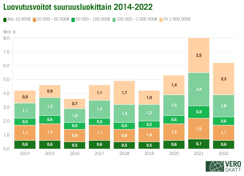 Suuret luovutusvoitot keskittyvät pienelle joukolle: yli 100 000 euroa luovutusvoittoa sai 7 500 asiakasta, eli noin kaksi prosenttia kaikista luovutusvoittoja saaneista. He saivat yhteensä 3,9 miljardia euroa luovutusvoittoja, eli 64 prosenttia vuoden 2022 luovutusvoitoista.