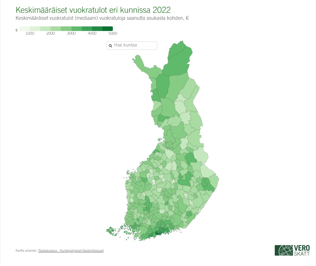 Kunnittain tarkasteltuna suurimpia vuokratuloja saivat kauniaislaiset mediaanin ollessa 5 006 euroa vuokratuloja saanutta asukasta kohden. Pienimmät vuokratulot olivat Kökarissa, 590 euroa vuokratuloja saanutta asukasta kohden.