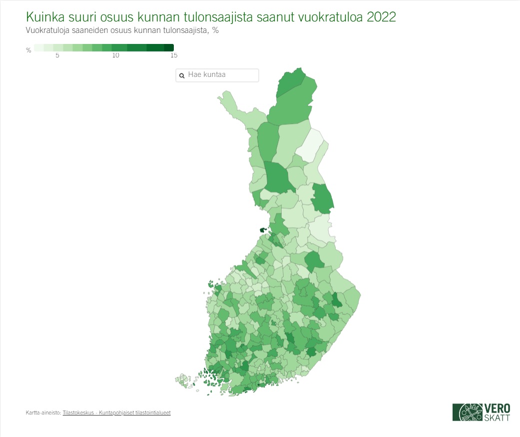 Yleisintä vuokratulojen saaminen oli Hailuodossa, jossa vuokratuloja sai 15 prosenttia tulonsaajista, ja harvinaisinta Savukoskella, Kökarissa ja Föglössä, joissa vuokratuloja saaneiden osuus oli kolmeprosenttia.