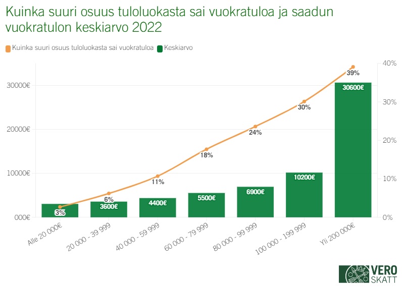 Eniten ansio- ja pääomatuloja tienanneet saivat myös vuokratuloja huomattavasti muita tuloluokkia enemmän. Yli 200 000 euroa vuodessa tienaavista 39 prosenttia sai lisäksi viime vuonna vuokratuloa keskiarvon ollessa reilut 30 000 euroa.
