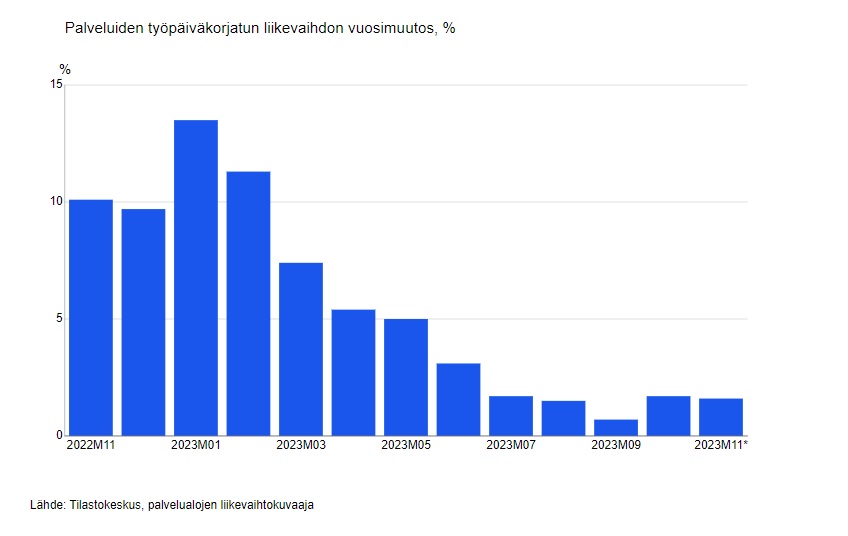 Tilastokeskuksen ennakkotietojen mukaan palvelualojen työpäiväkorjattu liikevaihto kasvoi marraskuussa 1,6 prosenttia vuoden 2022 marraskuusta. Palvelualoissa ei ole mukana kaupan toimialoja.