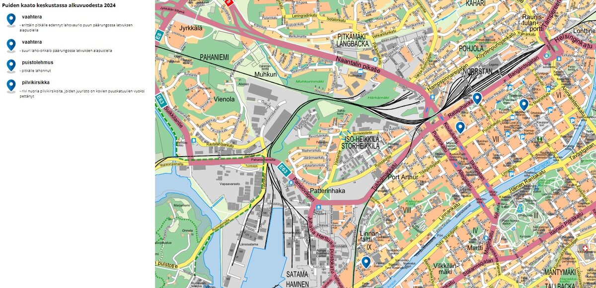 Puiden talvikaadot jatkuvat keskustassa Rautatientorilla, Rauhankadulla, Aurakadulla ja Raitiokujalla. Työt alkavat 29. tammikuuta ja kestävät noin viikon ajan. Työ aiheuttaa tilapäisiä häiriöitä alueiden kulkuyhteyksissä. Kaikkiin kohteisiin istutetaan jatkossa uusia puita.