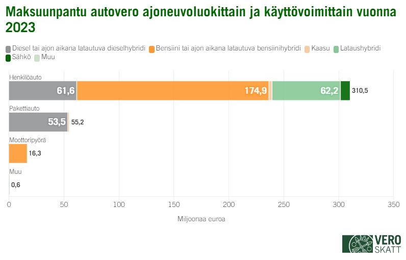Vuonna 2023 autoverotetuista ajoneuvoista 28,5 prosenttia oli sähkökäyttöisiä, mutta maksuunpannun autoveron määrästä vain 2,4 prosenttia kertyi sähköajoneuvoista.