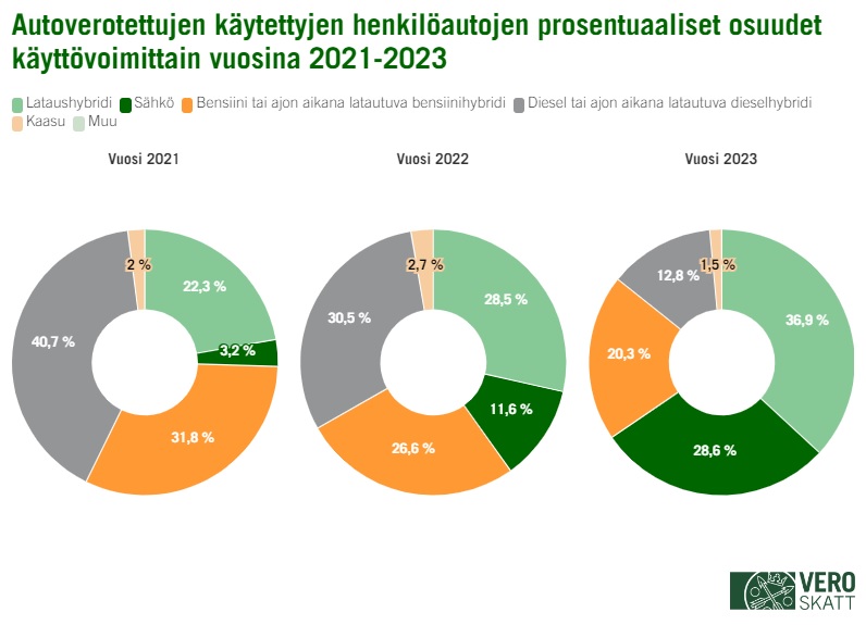 Vuoden 2023 aikana autoverotetuista käytetyistä henkilöautoista suurin osa (36,9 %) oli lataushybridejä. Lataushybridien osuus käytetyistä henkilöautoista on noussut 14,6 prosenttiyksiköllä vuodesta 2021. Myös sähköautojen osuus myös autoverotetuista käytetyistä henkilöautoista on kasvanut selvästi.