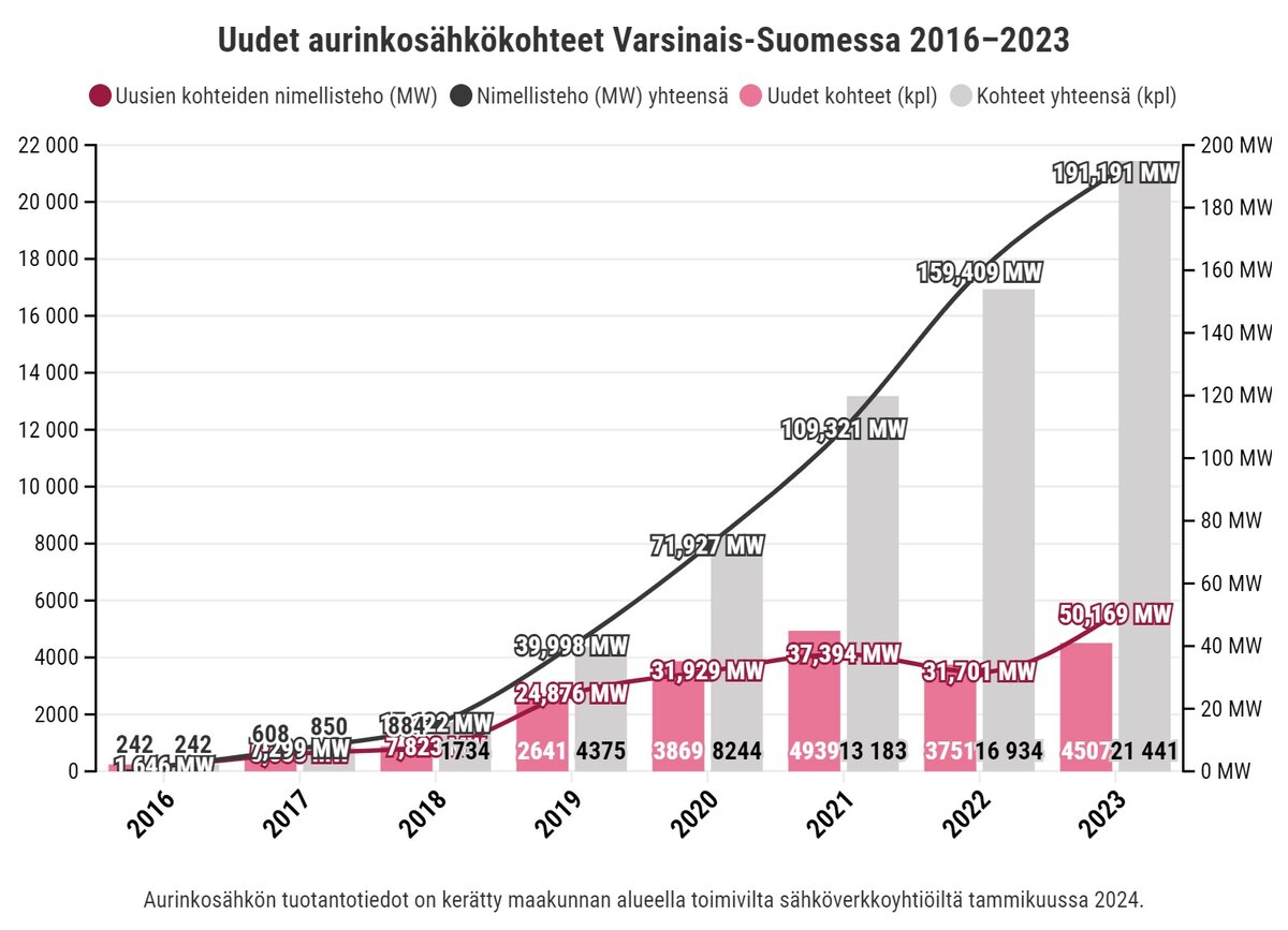 Valonia on koonnut alueen sähköverkkoyhtiöiltä tietoa verkkoon liitetyistä aurinkosähköjärjestelmistä vuosilta 2016–23. Viime vuonna maakunnassa oli lähes 17 000 aurinkosähköjärjestelmää (16 934) ja niiden nimellis-teho oli 191,17 megawattia (MW). Maakunnan verkkoon kytketyistä aurinkovoimaloista pääosa on edelleen asennettu pientaloihin. Tyypillinen voimalakoko pientaloissa kasvaa edelleen: tällä hetkellä se jo noin seitsemän kilowattia (kW), kun se kun se vuonna 2021 oli noin viisi kilowattia. Pientalojen aurinkosähköjärjestelmiä on laajennettu jälkikäteen, mutta siitä ei ole kerättyä tietoa. Taloyhtiöiden aurinkosähköjärjestelmien määrä vielä pieni, Varsinais-Suomessa on viime vuoden loppuun mennessä perustettu 20 taloyhtiöiden energiayhteisöä.