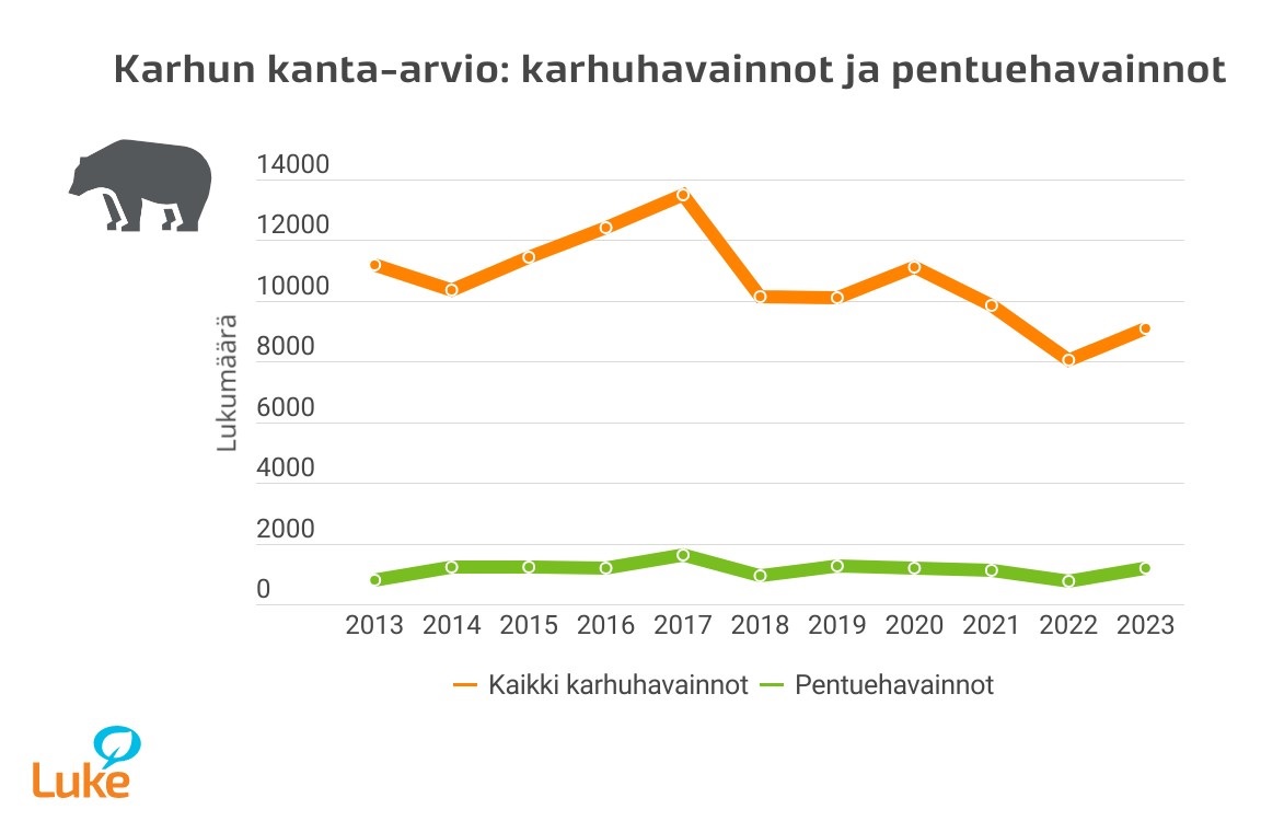 Arvio karhukannasta pohjautuu petoyhdyshenkilöiden kalenterivuonna 2023 kirjaamiin karhun pentuehavaintoihin. Karhuhavainnoista (yhteensä 9 084) pentuehavaintoja oli yhteensä 1 178. Pentuehavainto tarkoittaa havaintoa, jossa on tavattu emo ja alle vuoden ikäinen jälkeläinen.